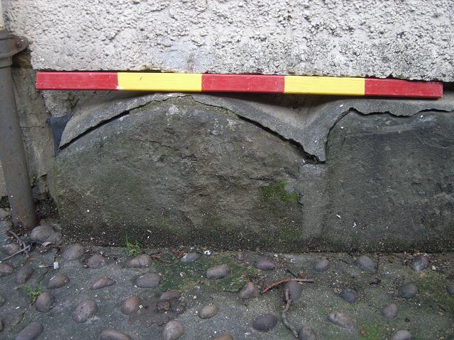 Curved topped headstone, mortared into a wall at the north side of the site. Only upper half visible and no inscription visible. May be face to the wall or surface completely eroded.