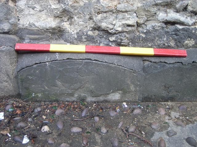 Curved topped headstone, mortared into a wall at the north side of the site. Only upper half visible and no inscription visible. May be face to the wall or surface completely eroded.