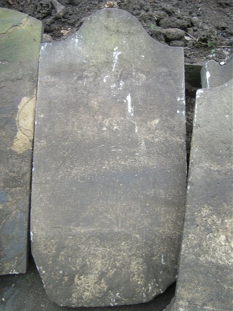 Ogee topped headstone which has been removed from its original position in the past, and reinstated against the north wall. Very eroded: