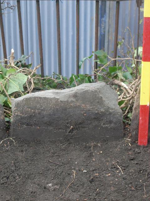 Headstone with broken top, which has been removed from its original position in the past, and reinstated against the north wall. Nothing legible.