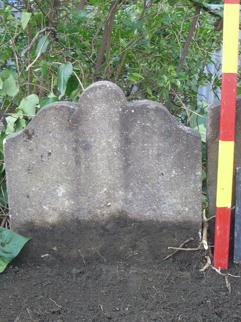 Triple round topped headstone, which has been removed from its original position in the past, and reinstated against the north wall. A knotted/bowed leaf motif across the lower half of the stone (in relief). Nothing legible.