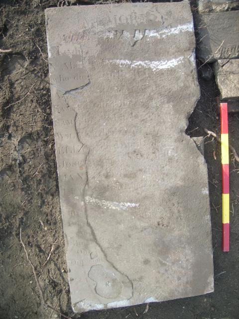 Ledger on a plinth, over an earth cut grave. Slight damage to ledger and plinth in the centre of north side and may possibly have been levered up in the past. Parts of face have flaked away: