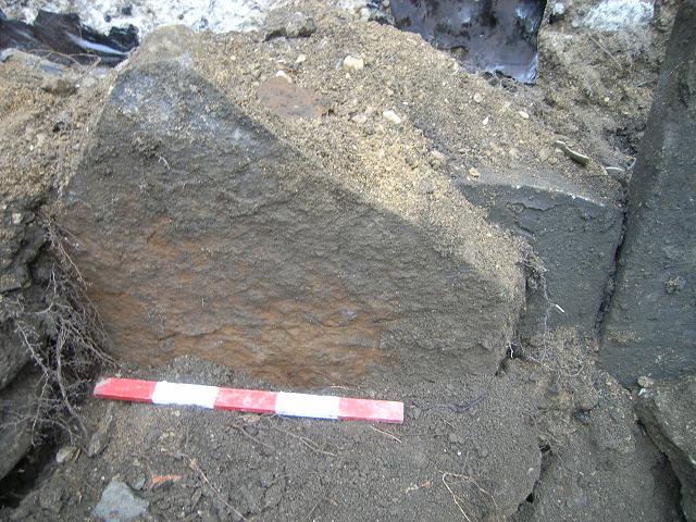 Possible headstone, rectangular with rounded corners and numerous cracks. Nothing readable.