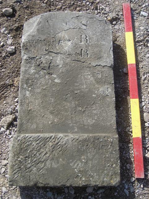 Curved topped footstone. Most of surface has eroded or flaked away: